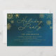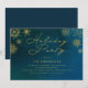 Holiday party invitation featuring the words "Holiday Party" in trendy script and snowflakes in faux gold foil against a midnight blue watercolor background on the front and a solid dark blue colour back.