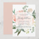 Elegant and modern floral engagement party invitation features a bouquet of soft pastel watercolor peonies in shades of blush pink, peach and cream, with lush green botanical leaves and eucalyptus. Your engagement party details are overlaid on a sheer white element in elegant smoky blue lettering accented with handwritten style calligraphy.
