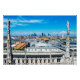 Painting of Milan skyline with modern skyscrapers in Porto Nuovo financial district and stone statues of Duomo Cathedral