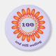 This refrigerator magnet features a bright orange flower with a milestone age at its center. The orange flower petals have yellow highlights to give the flower some depth. The number 100 is centered in the middle of the flower against a solid background color both of which can be customized if you wish. "100 and still smiling" is a positive message with a fun design for anyone who is lucky enough to be 100 years young.