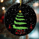 Design features a minimalist illustration of a Christmas tree made from green military WW2 aeroplanes. The tree is topped with a bright yellow star and the trunk spells out 'Merry Christmas' in red, fun font. On the sides of the tree sits 2 red small plaid coloured Christmas trees. Snow falls throughout entire surface of the ornament. The back has a heartfelt message of "Sky's finest pilot" and "Merry Christmas from, names" - all of which is customisable.