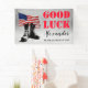 Rustic military going away banner featuring a rustic background with a patriotic american flag, a pair of army boots, a good luck message and their name.