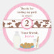 This pink and cow print Milk and Cookies Birthday Party sticker features milk, chocolate chip cookies and a makes a perfect favour tag. Matching invitation below. Some elements Sanqunetti Design.