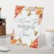 An elegant bridal shower sign with rust fall floral, maple tree leaves, acorns and elegant calligraphy.