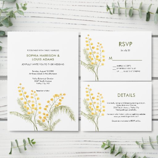 Mimosa watercolor yellow flowers wedding Thank you card.