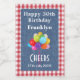 Classic vintage red and white gingham plaid frame with blue denim print background and colorful balloons are featured on this 2"x3" happy birthday mini wine bottle label. Easily change add-to or remove any of the white text to make it yours using the Template provided. Ideal for a party, favors or a simple gift. Each set includes 10 matte labels, scratch-resistant and waterproof. See "About" for more information.