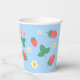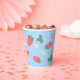 A sweet cute paper cup that features a delightful and playful pattern of scattered mini strawberries on a soft, sky blue background. The strawberries are rendered in a vibrant red with green leaves, and they are interspersed with small, delicate white or light yellow strawberry flowers, adding to the charm. The overall impression is cheerful, fresh, and sweet, making it ideal for children.