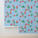 A sweet cute wallpaper that features a delightful and playful pattern of scattered mini strawberries on a soft, sky blue background. The strawberries are rendered in a vibrant red with green leaves, and they are interspersed with small, delicate white or light yellow strawberry flowers, adding to the charm. The overall impression is cheerful, fresh, and sweet, making it ideal for nursery’s decor and baby, toddler, child rooms.