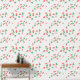 A sweet cute wallpaper that features a delightful and playful pattern of scattered mini strawberries on a sweet, light grey background. The strawberries are rendered in a vibrant red with green leaves, and they are interspersed with small, delicate white or light yellow strawberry flowers, adding to the charm. The overall impression is cheerful, fresh, and sweet, making it ideal for nursery’s decor and baby, toddler, child rooms.