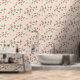 A sweet cute wallpaper that features a delightful and playful pattern of scattered mini strawberries on a sweet, light peach background. The strawberries are rendered in a vibrant red with green leaves, and they are interspersed with small, delicate white or light yellow strawberry flowers, adding to the charm. The overall impression is cheerful, fresh, and sweet, making it ideal for nursery’s decor and baby, toddler, child rooms.