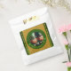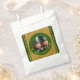 Miniature Leprechaun in 3D + "Happy St Patrick's Day" into a green circle + golden textured paper (image printed) as background. Design on favour bag.