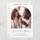 This simple, minimalist Save the Date card features a boho photo arch above the words "Save the Date" in elegant black handwriting script, followed by the couple's names, wedding date and city in sans serif font on a white background. Add a second, horizontal photo and a more detailed message with additional information on the reverse.