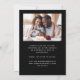 This simple, minimalist Save the Date card features a square photo above the words "Save the Date" in elegant white handwriting script, followed by the couple's names, wedding date and city in sans serif font on a black background. Add a second, horizontal photo and a more detailed message with additional information on the reverse.