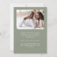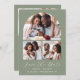 This simple, minimalist Save the Date card features a 3-photo collage arch above the words "Save the Date" in elegant white handwriting script, followed by the couple's names, wedding date and city in sans serif font on a sage green background. Add a fourth, horizontal photo and a more detailed message on the back.