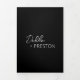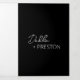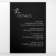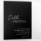 Modern black trifold wedding invitation featuring a simple and minimal design with the bride's name in an elegant script and the groom's name in a contemporary sans serif font. Below in the lower right corner are your event details in a minimalist layout. The middle panel has your favourite photo, the right panel is your RSVP card and the back has your additional details.