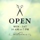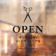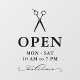 Open hours window clings for a hair salon or seamstress with a pair of scissors in black over OPEN written in elegant letters, and welcome in a swirly script. Add your opening hours. A clean, minimalist opening hours window decal for a hair salon, barbershop, or similar.