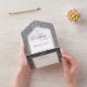 AVAILABLE WITH OR WITHOUT A QR CODE OR DINNER SELECTION OPTIONS. This design features a black and white marble background with a white text area framed in faux silver foil. A monogram with the bride and groom's first initial on the outside flap completes it. Created by Simply Farmhouse Press.