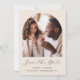 This simple, minimalist Save the Date card features a boho photo arch above the words "Save the Date" in elegant black handwriting script, followed by the couple's names, wedding date and city in sans serif font on a beige background. Add a more detailed message with additional information on the reverse.