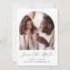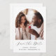 This simple, minimalist Save the Date card features a boho photo arch above the words "Save the Date" in elegant black handwriting script, followed by the couple's names, wedding date and city in sans serif font on a white background. Add a more detailed message with additional information on the reverse.