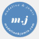 Modern and minimal bold blue retro style couple's personalised name, monogram, and wedding website stickers. The design features an arch text design with the couple's monogram displayed in large bold font.
