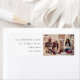 A stylish holiday photo return address label with classic typography in black on a clean simple minimalist white background. The photo, name and greeting can be easily customized for a personal touch. A simple, minimalist and contemporary christmas design to stand out this holiday season! The image shown is for illustration purposes only to be replaced with your own photo. The placeholder image is of a family portrait, the family including a little girl are wearing fair isle sweaters and socks. They are all wearing Santa hats including the family dog, a golden retriever. They are sitting on a sheepskin rug in front of a Christmas tree.