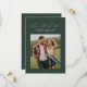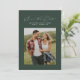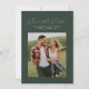 Simple, minimal and elegant, this one-photo vertical save the date is the perfect way to announce your engagement and upcoming wedding to friends and family. The script "save the date" sits above your custom type with plenty of room for names, wedding date, event location and any other info you'd like to share like a website. The back is a matching hunter green with a white dash pattern, but the colour can be changed by clicking "customise."