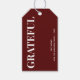 Minimal dark red coloured gift tags with the sentiment "GRATEFUL" and a white lettered greeting. The name, year, and greeting can be easily customised for a personal touch. A simple and contemporary Christmas design to stand out in any season or occasion!