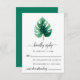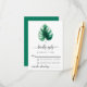 Modern RSVP card design featuring watercolor green monstera leaf illustration on a simple white background. Reverse side of the invitation is in deep green colour.