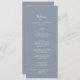 This minimal leaf blue and white wedding dinner menu card is perfect for an elegant wedding. The design features a simple greenery silhouette in white on a dusty blue background with classic minimalist style. This menu can be used for a wedding reception, rehearsal dinner, or any event.