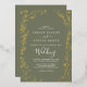 This minimal leaf gold foil dark green wedding foil invitation card is perfect for a boho wedding. The design features a simple greenery leaf silhouette in luxurious pressed gold foil on an olive green background with minimalist mountain bohemian style.