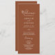 This minimal leaf terracotta wedding program is perfect for a boho wedding. The design features a simple greenery leaf silhouette in earthy burnt orange with minimalist desert bohemian style. Include the name of the couple, the wedding date and location, thank you message, order of service, wedding party and an optional "in loving memory" memorial.
