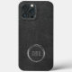 An iPhone 13 case with a minimalistic design showcasing a black leather look background accentuated by silver rings for your monogram that subtly embellish the case, creating a sleek and modern masculine look.
