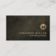Minimalist monogram design with a brushed metallic gold monogram emblem, classic block typography with personalised name and title below on a textured background in shades of black chestnut brown. Personalise for your custom use.