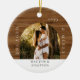 Celebrate your engagement with this elegant mid-century modern ornament, featuring a stylish faux brown wood and white two-tone design. A bold white stripe along the bottom highlights the couple’s name, while a minimalist square frame displays your favorite engagement photo. With one photo on each side, this ornament is a beautiful double-sided keepsake. The phrase “Engaged & Merry”, the year, and your names are displayed in a clean, modern font around the image – perfect for adding a personal touch to your holiday decor or gifting to a newly engaged couple. Design and Layout by ©Moodthology Papery