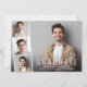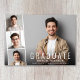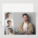 Minimal modern graduation announcement flat card featuring the graduate's photo overlayed with a strip of three smaller square photos and "Graduate," their name, school and class year in simple white typography.