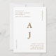 This modern minimalist white with golden brown color text wedding invitation features a big center monogram framed with wedding detail typography.