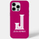 This minimal monogram hot pink iphone 15 pro max case is trendy yet and professional. It features your first initial in a bold trendy font and your name in a coordinating classic font in white. It's simple and classy.