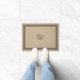 A doormat featuring a minimal style monogram framed in the centre. Underneath this towards the bottom is the established date of your family. The background contains a faux tan burlap pattern reminiscent of canvas fabric. The outside border frame is a deeper brown colour along with the monogram.