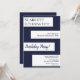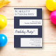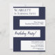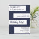 This elegant navy blue and white birthday invitation is perfect for a modern birthday. the simple design features elegant navy blue calligraphy on white stripes on a navy blue background.