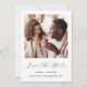 This simple, minimalist Save the Date card features a square photo above the words "Save the Date" in elegant black handwriting script, followed by the couple's names, wedding date and city in sans serif font on a white background. Add a more detailed message with additional information on the reverse.