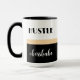 Hustle like a boss babe Mug. A modern, chic design with bold typography on a black and white background divided by a champagne gold-coloured border. Personalise the mug with your name on the back.