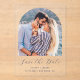 This simple, minimalist Save the Date card features a boho photo arch above the words "Save the Date" in elegant navy blue handwriting script, followed by the couple's names, wedding date and city in sans serif font on a clear background.