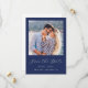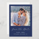 This simple, minimalist Save the Date card features a square photo above the words "Save the Date" in elegant white handwriting script, followed by the couple's names, wedding date and city in sans serif font on a navy blue background. Add a more detailed message with additional information on the reverse, along with a QR code to help guests access your wedding website.
