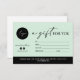 An elegant minimal gift certificate with A GIFT FOR YOU in handwritten casual font paired with a classic serif font with two social icons (Facebook and Instagram) and space for your social account. Along the bottom a black border with your full contact details in white over a light green mint colour background.Our gift certificate template strikes a perfect balance between modern elegance and personalised branding. You can easily integrate your business logo, ensuring your brand identity shines through.