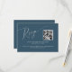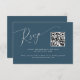 Elegant and minimal wedding RSVP card featuring a modern script text at the top with a QR code on a teal background. This simple design will work for any season. The card also includes meal choice options for guests to select from.
