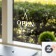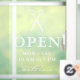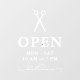 Open hours window clings for a hair salon or seamstress with a pair of scissors in white over OPEN written in elegant letters, and welcome in a swirly script. Add your opening hours. A clean, minimalist opening hours window decal for a hair salon, barbershop, or similar.
