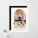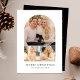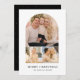 Modern holiday photo card featuring 3 of your photos arranged in an arch-shaped grid layout. Personalise the front of the multi-photo holiday card with your custom greeting and family name displayed in black lettering. The card reverses to a subtle black and white dot pattern.
