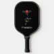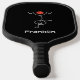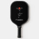 This modern pickleball paddle design features a simple black background, with your name in bold white text and a funny cartoon illustration of a person with a pickleball ball, for a look that is simple and stylish, yet professional.