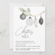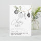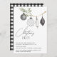 This minimalist Christmas party invitation features a watercolor branch, fun patterned ornaments and calligraphy script text. The back is a watercolor black and white buffalo plaid.