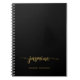 Girly Feminine Minimalist Simple Clean Black And Gold Monogram Name Signature Script Custom Personalised Notebook. These design featuring your first name in a pretty hand lettered style swash tail font typography, with full name template on black and gold background. These are easy to customise and can be used as a Cookbook, Diary Planner, Sketchbook, Journal and more. Also great stylish feminine gift for birthday, mother’s day, wedding, bridal shower, sweet 16 birthday party and baby shower, graduation, business, back to school, professional work and for anyone who likes simple clean things.